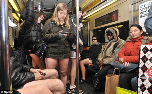 在坐上地鐵前,他們要先將褲子脫下并塞入包中,而后假裝若無其事的乘坐地鐵。組織者要求這些參與者們裝作互相不認識,制造“巧合”的感覺。