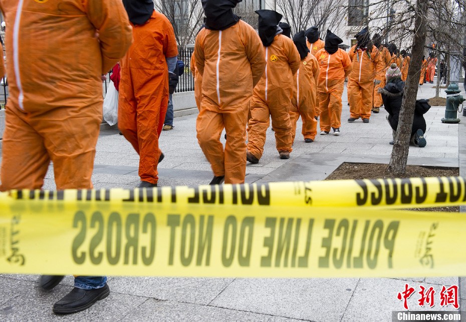 1月11日,美國華盛頓,示威者穿著橙色的囚服游行,要求關閉關塔那摩監獄。當天是關塔那摩監獄建立9周年紀念日。