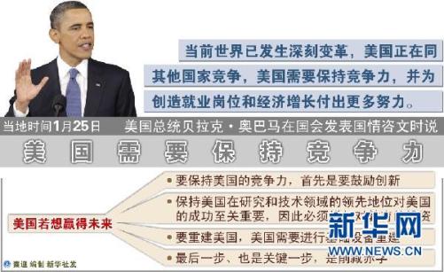 美國總統貝拉克·奧巴馬在昨天發表的國情咨文中說,來自中國和印度等新興經濟大國的競爭對美國主導地位構成了重大挑戰,他呼吁美國人在創新、教育和建設方面超越其他國家,以便“贏得未來”。