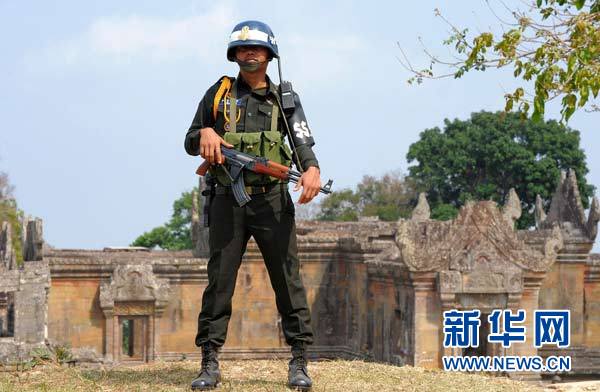 柬埔寨軍方人士2月4日說,當天下午柬埔寨和泰國邊防軍在柏威夏地區發生武裝沖突,目前雙方傷亡情況不明。這是2010年2月6日拍攝的柬埔寨士兵守衛在柬泰邊境柏威夏寺的資料照片。新華社/法新