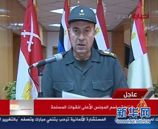 2月11日,埃及軍方發(fā)言人在國(guó)家電視臺(tái)宣讀“第三號(hào)公報(bào)”(半島電視臺(tái)截圖)。在埃及總統(tǒng)穆巴拉克11日宣布辭職并將權(quán)力交給軍方后不久,埃及武裝部隊(duì)最高委員會(huì)當(dāng)晚發(fā)布公報(bào),表示不會(huì)取代合法政府,并將對(duì)權(quán)力過(guò)渡作出安排。新華社發(fā)