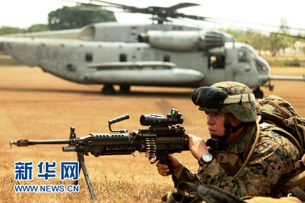 2月13日,一名步兵在一次直升機襲擊演練中為直升機做火力掩護。 當日,“金色眼鏡蛇”年度聯合軍演在泰國繼續舉行, 來自泰國、美國、印度尼西亞、新加坡、日本、韓國、馬來西亞等國的約1.1萬名軍事人員參加。本年度的聯合軍演從2月7日開始,將持續到2月18日結束,演習主要場所包括泰國中部和北部主要海陸空軍事基地及演練場。新華社發