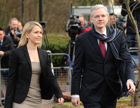24日,倫敦,阿桑奇(右)和他的律師到達法院。