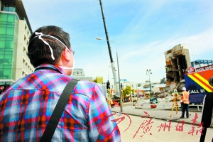 本報(bào)記者在封鎖線外看CTV大樓遺址。 本報(bào)特約記者 王世瑞 攝