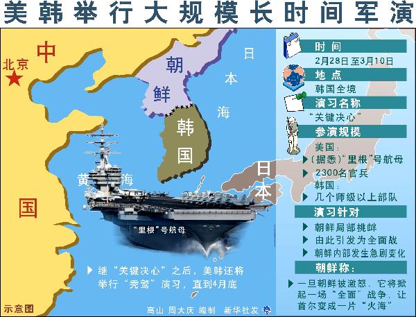 2月28日上午,美國與韓國開始年度例行的“關(guān)鍵決心”和“禿鷲”大規(guī)模聯(lián)合軍演,其中“關(guān)鍵決心”聯(lián)合軍演將持續(xù)11天,“禿鷲”則將一直進(jìn)行到4月底。同一天,美日聯(lián)合軍演也在日本的橫須賀基地展開,這是兩國的宙斯盾艦首次聯(lián)網(wǎng)實(shí)施彈道導(dǎo)彈攔截模擬演習(xí),演習(xí)將一直持續(xù)到3月3日。美韓、美日軍演輪番登場,朝鮮反應(yīng)強(qiáng)烈,半島局勢再次緊張。