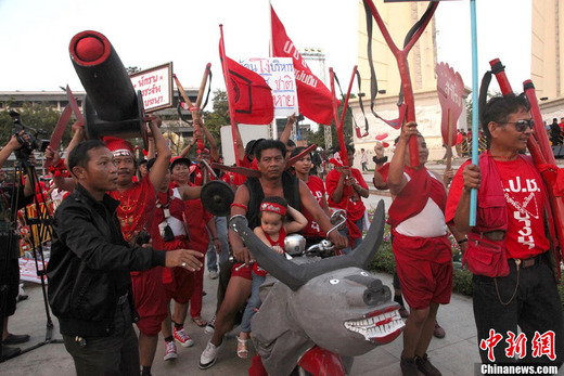 資料圖:當(dāng)?shù)貢r(shí)間2011年2月13日下午,泰國(guó)“紅衫軍”在首都曼谷舉行大規(guī)模集會(huì)示威活動(dòng),要求政府釋放仍羈押獄中的“紅衫軍”領(lǐng)導(dǎo)人。圖為當(dāng)天傍晚時(shí)分,“紅衫軍”部分支持者高舉“土炮”模型、巨型彈弓繞民主紀(jì)念碑游行。中新社發(fā) 余顯倫 攝