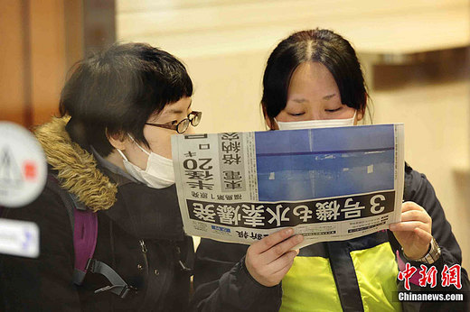 3月14日下午,兩名日本仙臺市的女性在看關于福島核電站的報道。報紙頭版寫道《第三號機組也發生氫氣爆炸》。據報道,位于福島縣境內的福島第三核電站發生了氫氣爆炸。中新社發 侯宇 攝