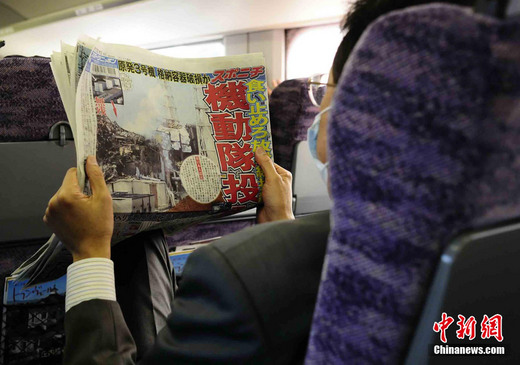 3月17日下午,在一列前往東京的新干線列車上,一名日本人在閱讀關于福島核電站三號機組最新狀況的報道。中新社發 侯宇 攝