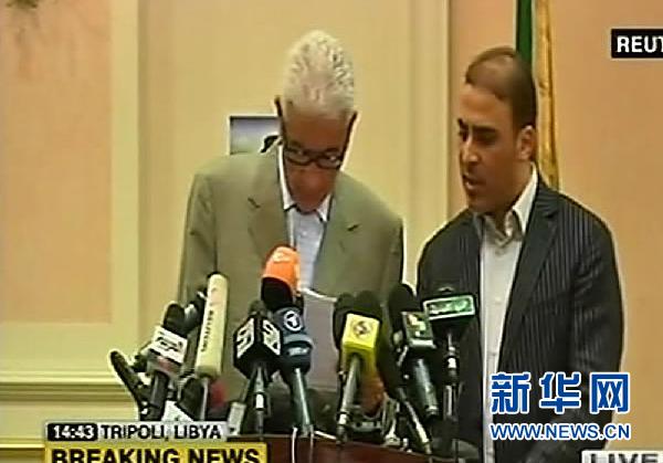 這張3月18日的電視截圖顯示,利比亞外長穆薩·庫薩(左)在宣讀聲明。利比亞外長穆薩·庫薩當日宣布,利比亞接受聯合國有關在利比亞設立禁飛區的決議,立即停火并停止所有軍事行動。 新華社發
