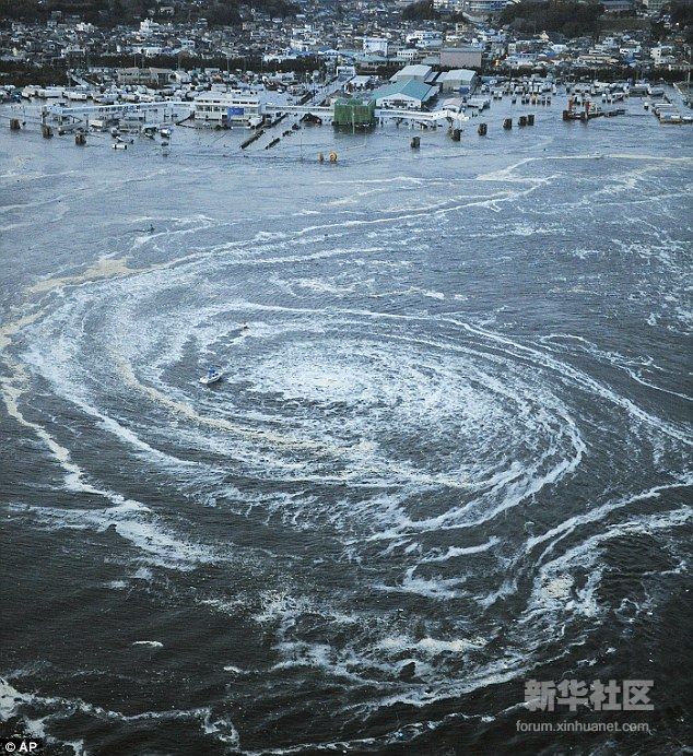 11日,在日本茨城縣,地震引發(fā)的海嘯形成漩渦。