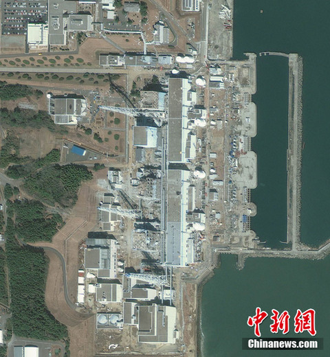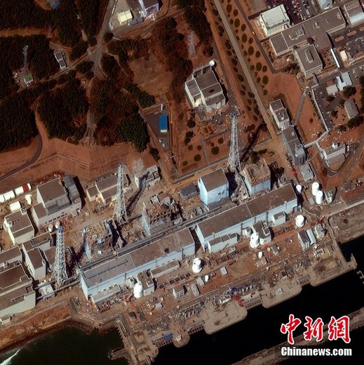 3月18日拍攝的衛星照片顯示的是,日本福島第一核電站1號機組到4號機組(從右到左)。