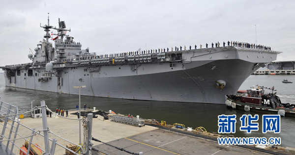 3月23日,在美國弗吉尼亞州諾福克海軍基地,“巴丹島”號兩棲攻擊艦離港。當(dāng)天,美國海軍派出由“巴丹島”號兩棲攻擊艦、“弗德臺地”號兩棲船塢運(yùn)輸艦與“惠德比島”號船塢登陸艦組成的兩棲作戰(zhàn)艦隊(duì),攜艦載戰(zhàn)斗機(jī)、海軍陸戰(zhàn)隊(duì)和醫(yī)療設(shè)施前往地中海參與針對利比亞的軍事行動。新華社記者張軍攝