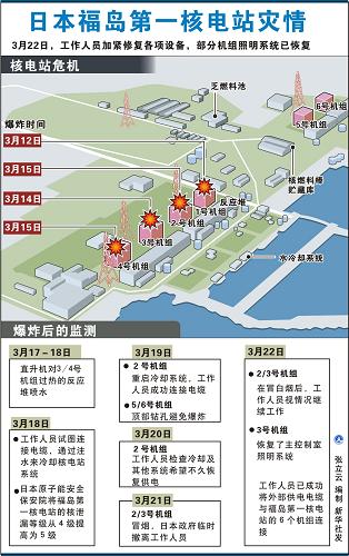 消防員和自衛隊員當天也繼續利用特殊泵車對4號機組的乏燃料池注水降溫。同時,3號和4號機組的照明系統目前已部分恢復,一旦主控制室重新投入使用,工作人員就可采取更有針對性的措施進一步穩定受損機組的狀況。但在接通電源的作業中還是出現了兩名工作人員受傷的情況,他們目前已被送往醫院治療。