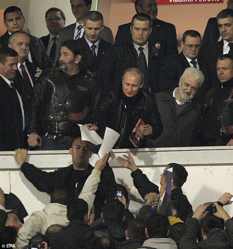 普京和“飛車黨”們一起看了俄羅斯頂點俱樂部和斯爾維亞紅星俱樂部青年隊的足球賽下半場。普京在前排VIP區落座。當有觀眾叫出他的名字時,這位俄羅斯總理站起來向人群揮手,還接受了簽名,引來一片歡呼。