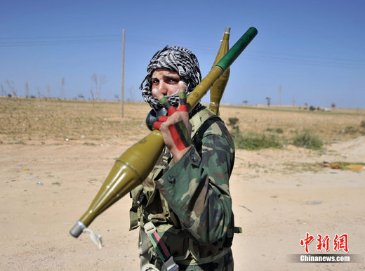 2011年3月23日,利比亞?wèn)|部重鎮(zhèn)艾季達(dá)比耶市郊,一名手持火箭彈的反政府武裝士兵打出“勝利”的手勢(shì)。