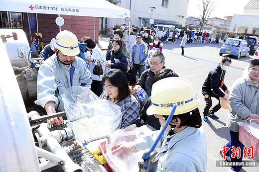 3月13日,福島縣福島市一處紅十字救助站,居民排隊領淡水。中新社記者 侯宇 攝