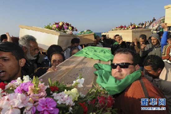 資料圖片:3月24日,在利比亞首都的黎波里,市民抬著即將下葬的棺槨走向一座公墓。利比亞官方當日宣布,近100名平民在西方聯(lián)軍空襲中喪生。新華社記者楊光攝