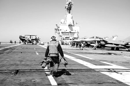 3月25日,一名法國海軍技術(shù)人員在“戴高樂”號航母上,準備執(zhí)行對利比亞的軍事任務(wù)。
