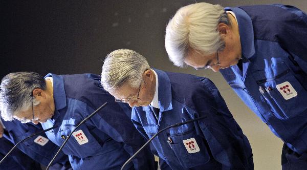 3月30日,日本東京電力公司會長勝俁恒久(中)在東京舉行的新聞發布會上鞠躬。勝俁恒久當日在此表示,客觀地分析福島第一核電站1號至4號機組的現狀,“可以說不得不報廢”。 新華社/法新