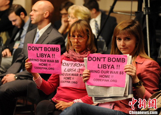 圖為美國著名反戰組織“粉紅密碼”兩名成員當日在參議院軍事委員會的聽證會上舉著反對轟炸利比亞的標語進行抗議。中新社發 吳慶才 攝