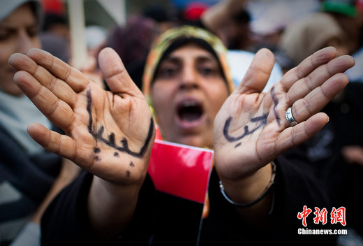 2011年3月23日,利比亞?wèn)|部城市班加西,在一個(gè)支持多國(guó)部隊(duì)空襲利比亞的活動(dòng)中,一個(gè)女人舉起寫(xiě)著“我愛(ài)利比亞”的雙手。