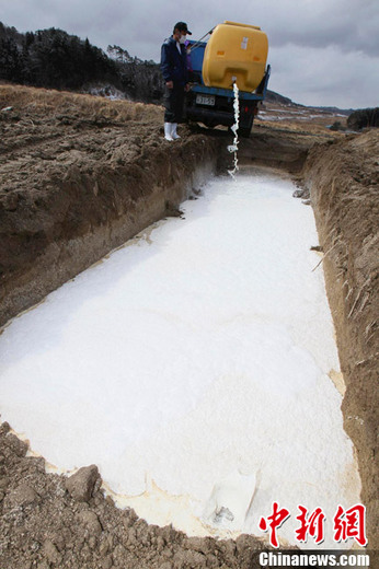 3月23日,日本福島縣Iitate,一位農(nóng)民將牛奶倒入土坑中。福島縣周邊地區(qū)原奶和蔬菜等農(nóng)畜產(chǎn)品的受輻射污染范圍23日呈擴大態(tài)勢,首相菅直人當(dāng)天首次要求人們不要食用福島縣生產(chǎn)的一些種類的農(nóng)產(chǎn)品。