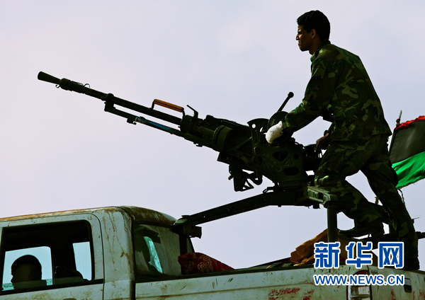 4月6日,在利比亞?wèn)|部城市布雷加前線,一名反政府軍士兵坐在載有重型機(jī)關(guān)槍的卡車(chē)上。在北約空軍的空襲配合下,反政府軍當(dāng)天向布雷加發(fā)起進(jìn)攻,但尚不確定是否已攻占布雷加城。新華社記者才揚(yáng)攝