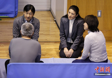 日本皇太子德仁6日下午偕同雅子妃赴東京都調布市的味之素體育館,慰問震災避難災民。據臺灣《中國時報》報道,皇太子夫婦繞行收容130名災民的體育館,跪著傾聽每個災民心聲。這也是患適應障礙癥難得曝光的雅子,去年十月以來首次外出執行公務。