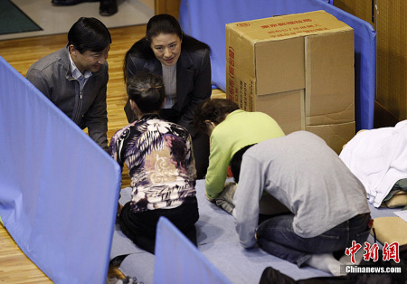 日本皇太子德仁6日下午偕同雅子妃赴東京都調布市的味之素體育館,慰問震災避難災民。