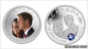 面值20加元的銀幣售價(jià)105加元(109美元或67英鎊),里面鑲有藍(lán)寶石顏色的圓形水晶來象征新娘的訂婚戒指。