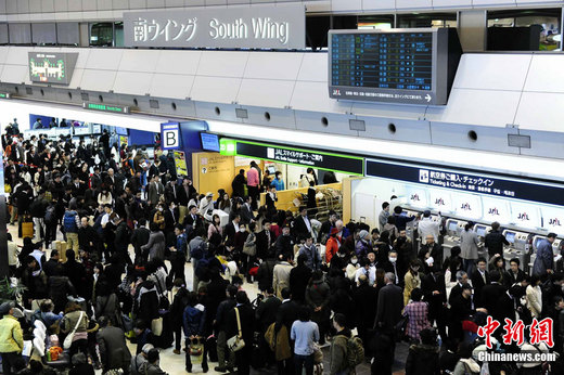 3月12日下午,因11日發生的日本東北地區大地震而滯留東京羽田機場的大量旅客正在排隊等候最新的航班情況。中新社發 侯宇 攝