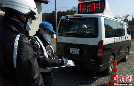 3月30日,記者駕車準備前往距離福島第一核電站30公里的南相馬市。剛一進入南相馬市境內,就被3名全副武裝的警察攔了下來。這3名警察來自廣島,他們奉命在此提醒每一位路過的車輛,由此進入30公里半徑范圍,有核輻射的可能。據警察介紹,在30公里半徑范圍有數個這樣的關卡,而在20公里半徑,這樣的關卡更加密集。圖為執行警示任務的廣島警察。中新社發 孫冉 攝