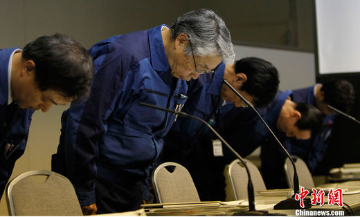2011年3月28日,東京,東京電力公司召開新聞發布會,通報福島核電站最新輻射情況,公司高管就“福島核電站積水輻射超標數值錯誤”的問題,向民眾鞠躬道歉。