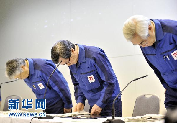 4月13日,在日本東京電力公司總部,東京電力公司社長清水正孝(中)及兩名副社長在新聞發(fā)布會上鞠躬致歉。當日,東電在東京總部召開新聞發(fā)布會,社長清水正孝在發(fā)布會上就福島核危機向公眾致歉。 新華社/法新