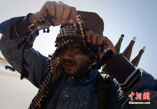 2011年3月22日,班加西南部,一名反政府武裝士兵調整自己的頭巾。