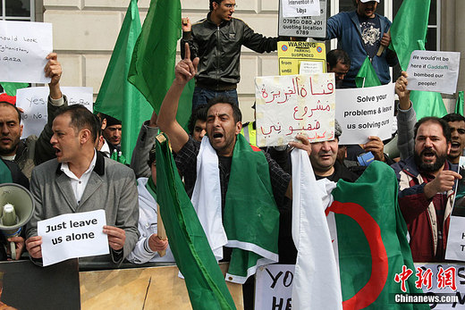 當(dāng)?shù)貢r(shí)間3月29日下午,約40個(gè)國(guó)家和國(guó)際組織的外長(zhǎng)及代表在倫敦參加有關(guān)利比亞局勢(shì)的國(guó)際會(huì)議,上百名居住在倫敦的利比亞、卡塔爾等國(guó)抗議者在蘭卡斯特宮會(huì)場(chǎng)外示威,要求西方國(guó)家停止轟炸,停止干涉利比亞內(nèi)政。中新社發(fā) 魏群 攝