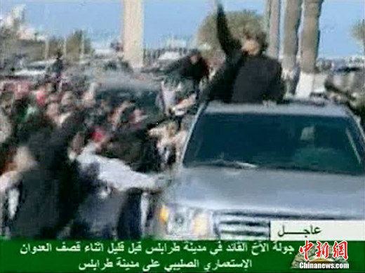 利比亞國家電視臺(tái)14日播放了卡扎菲當(dāng)天視察的黎波里并在街頭與支持者會(huì)面的視頻。卡扎菲站在一輛敞篷車上,身著休閑西裝,戴著墨鏡,揮舞拳頭,并和簇?fù)矶恋闹С终呶帐帧k娨暸_(tái)稱,就在卡扎菲現(xiàn)身的同時(shí),北約戰(zhàn)機(jī)對(duì)的黎波里進(jìn)行了輪番轟炸。