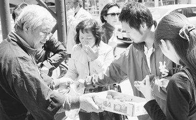 4月17日,來自日本福島縣矢祭町的一名農(nóng)民(左)在東京街頭促銷農(nóng)產(chǎn)品。新華社發(fā)