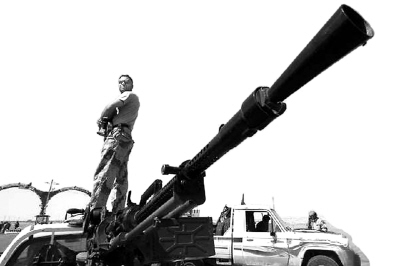 4月14日,一名利比亞反政府武裝人員在艾季達比耶前線站在一門高射機槍上瞭望。 新華社發