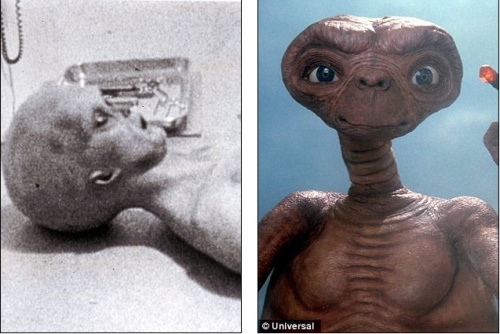 從視頻解圖上可以看到,“外星人”大概有0.6米高,長得很像電影科幻片《E.T.》當中的外星人,而其“尸體”已嚴重損毀:右腿斷裂,眼睛的部位也只有兩個洞,頭部長得向人類的顱骨。