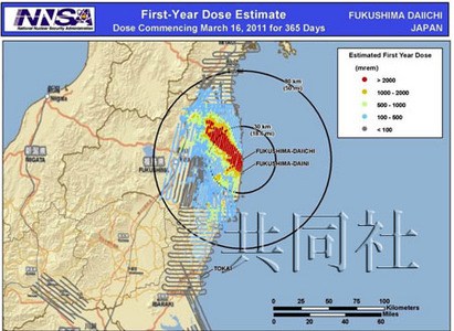 模擬圖顯示,核電站西北40~50公里范圍內1年累積輻射量可能超過20微希。模擬圖根據飛機獲得的監測數據繪制,以人在室內受到的輻射量也不會減少為假設。