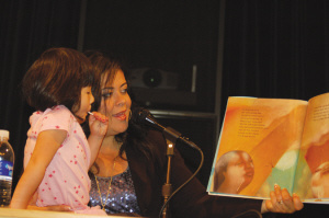 總統(tǒng)奧巴馬的妹妹、華人之妻瑪雅懷抱兩歲的女兒薩薇塔·吳為讀者朗讀她創(chuàng)作的兒童讀物《通往月亮之梯》。(美國(guó)《僑報(bào)》/邱晨 攝)