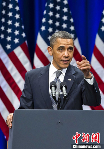 當(dāng)?shù)貢r(shí)間4月20日晚間,美國(guó)總統(tǒng)奧巴馬在舊金山美生堂出席民主黨全國(guó)委員會(huì)籌款大會(huì)并發(fā)表演講。圖為奧巴馬演講。中新社發(fā) 陳鋼 攝