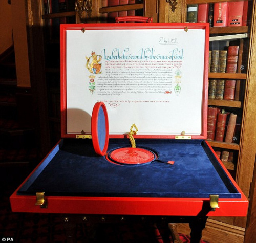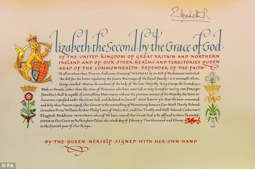 這份由女王親筆簽署、用花體字謄抄的詳盡準(zhǔn)許通告,正式宣布同意“我們最為至愛的皇孫威爾士王子、嘉德騎士威廉?亞瑟?菲利普?路易斯,和我們信任的深受喜愛的凱瑟琳?伊麗莎白?米德爾頓結(jié)為連理”。