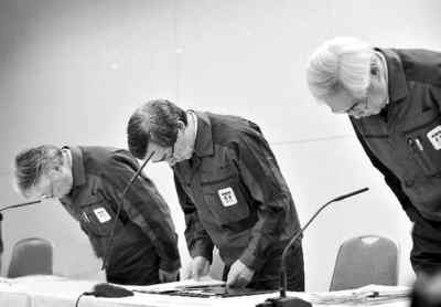 4月13日,在日本東京電力公司總部,東京電力公司社長清水正孝(中)及兩名副社長在新聞發布會上鞠躬致歉。當天,東電在東京總部召開新聞發布會,社長清水正孝在發布會上就福島核危機向公眾致歉。 新華社/法新