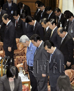 日本眾院預(yù)算委員會26日進行大地震后的首次審議,全體與會者為震災(zāi)遇難者默哀。(共同社)