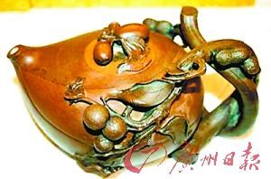 《早生貴子》澄泥石壺高12厘米,長18厘米,寬15厘米。在創作中特別設計了中國傳統婚禮中最常見的紅棗、花生、桂圓三種吉祥物,寓意“早生貴子”。