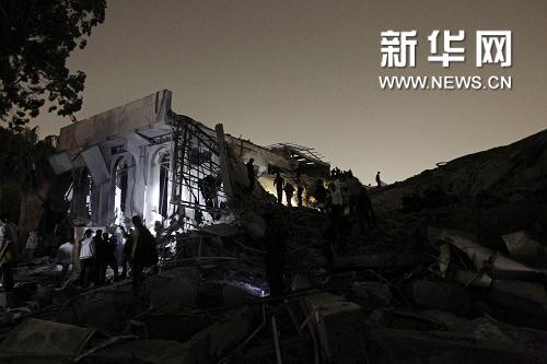 4月25日,在利比亞首都的黎波里,利比亞安全人員查看被轟炸的利比亞領導人卡扎菲的官邸。北約戰機25日凌晨對利比亞領導人卡扎菲在的黎波里的官邸實施轟炸。利比亞政府官員譴責北約企圖殺害卡扎菲,并稱轟炸造成45人受傷、卡扎菲辦公室受損嚴重。新華社/法新