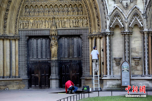 距英國威廉王子和凱特﹒米德爾頓大婚還有兩天,婚禮舉辦地倫敦威斯敏斯特教堂已拒絕游人進入。圖為工人們27日在對教堂大門進行最后的修繕。中新社發(fā) 魏群 攝