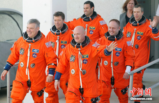2011年4月1日,“奮進”號航天飛機的機組人員在美國佛羅里達州卡納維拉爾角NASA的發射基地亮相。